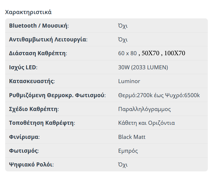 Καθρέπτης COB LIGHT 60x80 ,50x70 , 100x70 εκ. φωτιζόμενος LED, με μαύρο μεταλλικό πλαίσιο, LUMINOR
