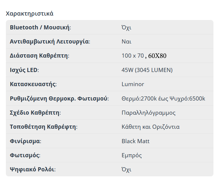 Καθρέπτης TOSCA, 100x70 , 60X80 εκ. φωτιζόμενος LED, με Μαύρο πλαίσιο αλουμινίου, LUMINOR